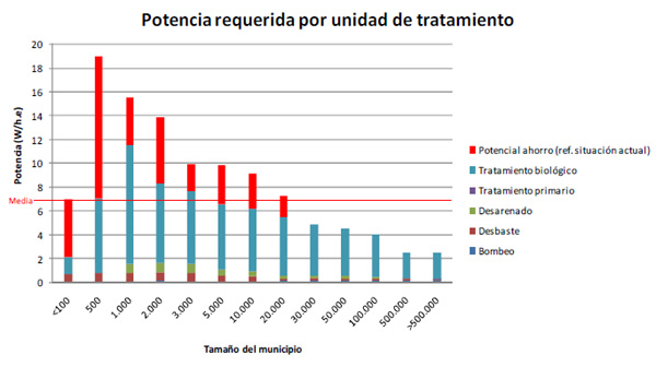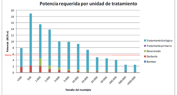 En el informe sobre el Consumo energético en el Sector del Agua que realizó el IDEA en 2010, se incluye esta gráfica con la potencia por unidad de tratamiento, expresado en watios por habitante equivalente.